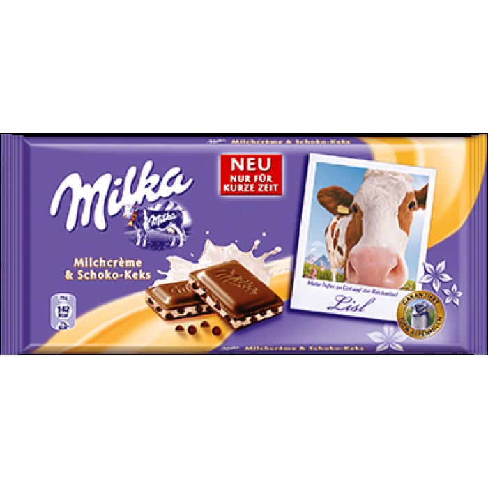 Milka Milk Cream and Cocoa Biscuit / Cow Lisl 100g - a bar of chocolate made with Alpine milk chocolate, a fine milk cream and crunchy chocolate biscuit pieces. Limited COW edition.